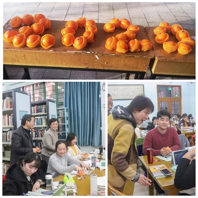 下午3时30分,所有志愿者集合在图书馆门口准备此次党日活动的慰问品——丹桂苑采集的桂花精心制作而成的状元桂花糕和清香的蜜橙。桂花素有蟾宫折桂一说,香橙又有心想事成之意,都饱含学校、学院对考研学子的祝福。志愿者们也用慰问品摆出“2020+U”字样,寓意“2020届管院学子加油”,为同学们加油打气。下午4时起,大家便开始在图书馆为同学们分发状元桂花糕和香橙,预祝每一位考研学子在考试中蟾宫折桂,考研高中,心想事成。老师们首先肯定了同学们勤奋学习、积极上进的备考状态,同时也嘱咐备考同学们要抵住寒冷,坚持到底,永不言弃;劳逸结合,科学备考;调整心态,沉着应考;稳扎稳打,摒弃浮躁,完成好关键的“最后一公里”冲刺。