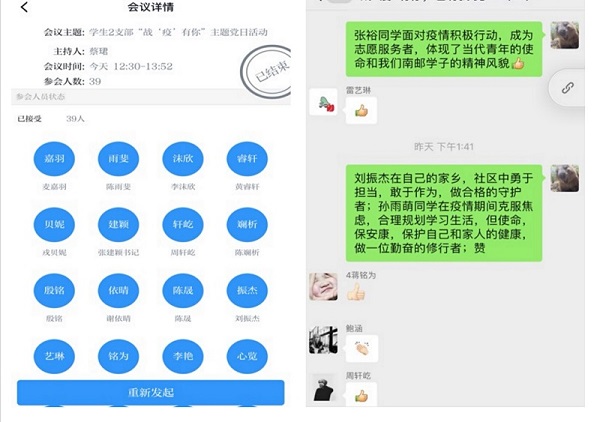 主题党日活动的后半部分,同学们对如何在疫情中做好防护,在战“疫”中贡献力量畅所欲言。部分同学在线分享了自己在疫情防控期间积极参与志愿服务的小故事:张裕同学作为社区里第一名大学生志愿者,在疫情初期就主动请缨加入当地防疫点,穿起红马甲参与防疫检查工作,负责排查外来车辆,登记外来流动人员,提醒行人戴好口罩等。王亚鹏同学在村里参与疫情防控,从一开始的不被理解,到后来经过自己的耐心和坚持,得到了当地村民的认同和感谢。在学校开始在线授课后,他还组织学院青年志愿者协会的进二十八名同学们利用课余时间共同参加线上志愿活动,网络辅导南京廖家巷社区共计14名中小学生课业,在抗击疫情的特殊时期贡献自己的一份力量。