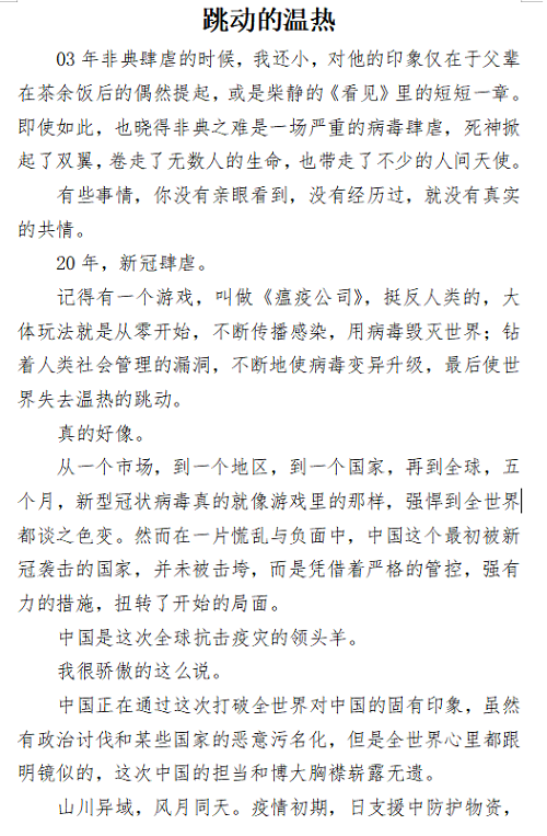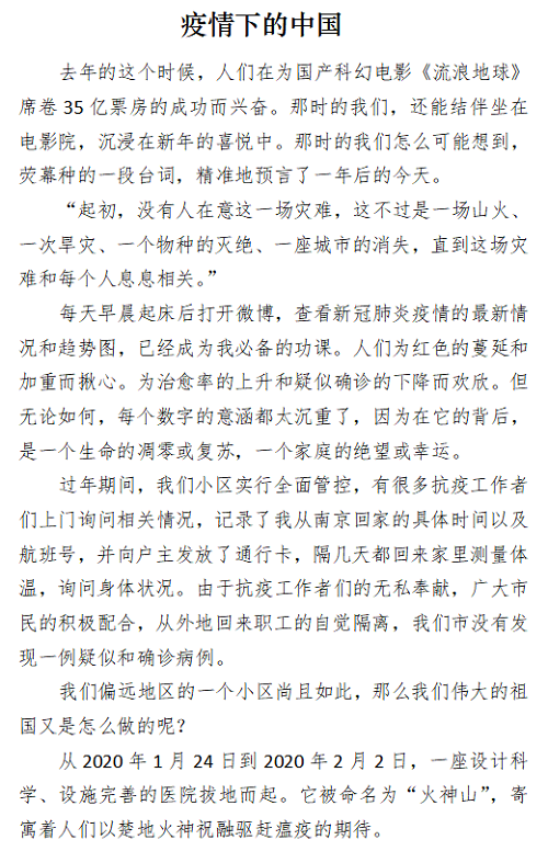为了记录疫情当前的动人事迹,激发同学们的家国情怀,营造良好的校园文化气氛。37000vip威尼斯分团委、37000vip威尼斯听风文学社于本学期4月-5月承办“疫情下的中国”主题征文比赛。