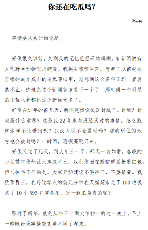 三等奖 37000vip威尼斯 邱洧桦(笔名秋三有)《你还在吃瓜吗?》