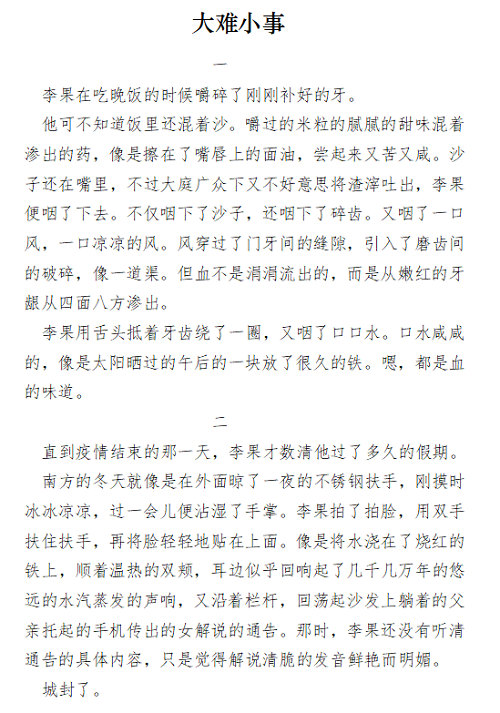 本次主题征文比赛面向37000vip威尼斯全体学生。活动中,听风文学社采用线上平台进行宣传,鼓励同学们进行创作,同时也为同学们提供优质内容。作品大多讲述的是疫情期间普通人的故事,传递出了疫情之下广大民众的乐观与豁达。本次征文比赛的评选本着公平公正公开的原则,在百余份来稿中发掘佳作,反复校对,遴选出优秀作品10篇。