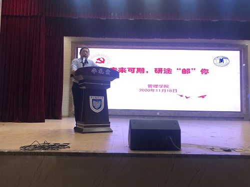 黄卫东院长带来的主题为《未来可期,研途“邮”你》的专题思政课。黄院长用数据和前例说话,先告诉同学们不仅要让学习成为常态,更要系统地全面地进行学习,后又指出研究生考试才是通往成功未来的捷径。黄院长的指点不仅让大三的同学们对现在的考研形势和备考工作有了一定的认识和理解,而且激发了全体同学考研的热情,坚定了还在迷茫阶段的同学们的考研信心。