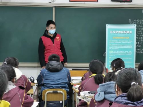 同于2021年1月22号下午3:00左右,张惟天同学来到南京市玄武高级中学,为高二的孩子们介绍了在学校这样的公共区域以及后续放假后在家隔离期间的注意事项。同行的同伴也通过自身曾经与确诊患者同处一辆飞机,接受过检测与隔离的经历,提醒了学生们新冠与我们并不遥远,需要每个人的高度重视与警惕。