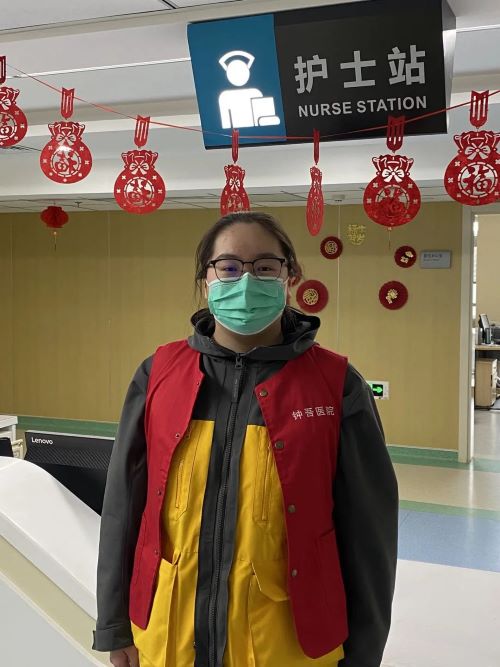 农历初五,李依繁同学来到宿迁市宿城区的一家医院,被安排到检验科,根据疫情要求,核酸检验点与常规化验室分开,许多患者和家属找不到检测点,一些老年人不会使用取号机,检测报告也需要志愿者帮助病人扫码拿取,由于检测人数多,有时报告无法及时出来,志愿者还需耐心抚慰情绪紧张的家属。上午十点左右医院人流量达到高峰,李依繁同学在检验点与取单处来回奔走,以便及时地帮助被检人员拿取检验报告和减少检验医生的压力。