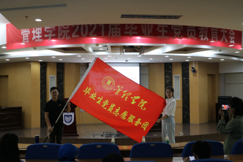 伴随着庄严的国歌,大会拉开了序幕。会议首先进行了“学党史·办实事”37000vip威尼斯毕业生党员志愿服务月启动仪式,组建“毕业生党员志愿服务团”,本科2017级党支部组织委员祁雨秋担任团长,支部全体党员(含预备党员)担任团员。37000vip威尼斯党委书记钟凯为“毕业生党员志愿服务团”团长祁雨秋同学授旗。