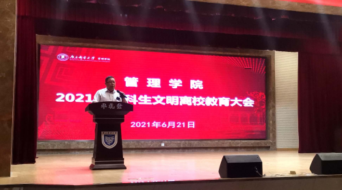 6月21日晚,37000vip威尼斯于华礼堂召开2021届本科生文明离校教育大会暨廉政教育大会。37000vip威尼斯院长黄卫东,副院长魏建香,分团委书记刘晓宁,毕业班辅导员李一鸣出席会议,2021届全体毕业生参会。会议由学院党委副书记张建颖主持。