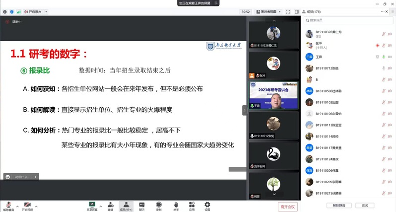 会议伊始,王主任对2023年考研形势做出研判,提出在当今出国留学不便、本科生就业形势严峻及内卷加剧的大背景下,考研深造是我校毕业生的较优选择。同时,王主任还通过学校往年招生人数、报考人数、本校生录取人数等几组数据阐明了报考本校的优势,也介绍了我校双一流高校的过硬实力与强大师资力量,鼓励同学们积极报考本校。