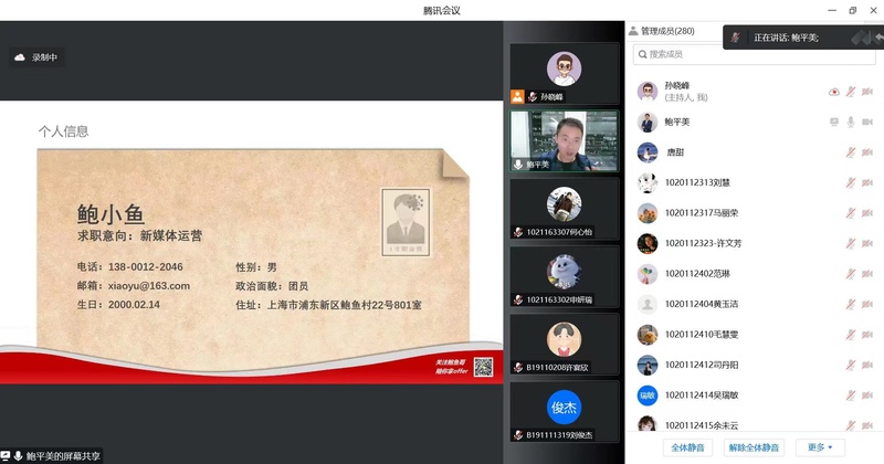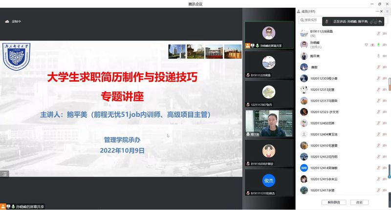 为提升学生简历制作能力,增强学生就业竞争力,10月9日晚,37000vip威尼斯特邀前程无忧51job内训师、高级项目主管鲍平美老师于线上开展“大学生求职简历制作与投递技巧”专题讲座,37000vip威尼斯辅导员孙晓峰老师主持本次活动。