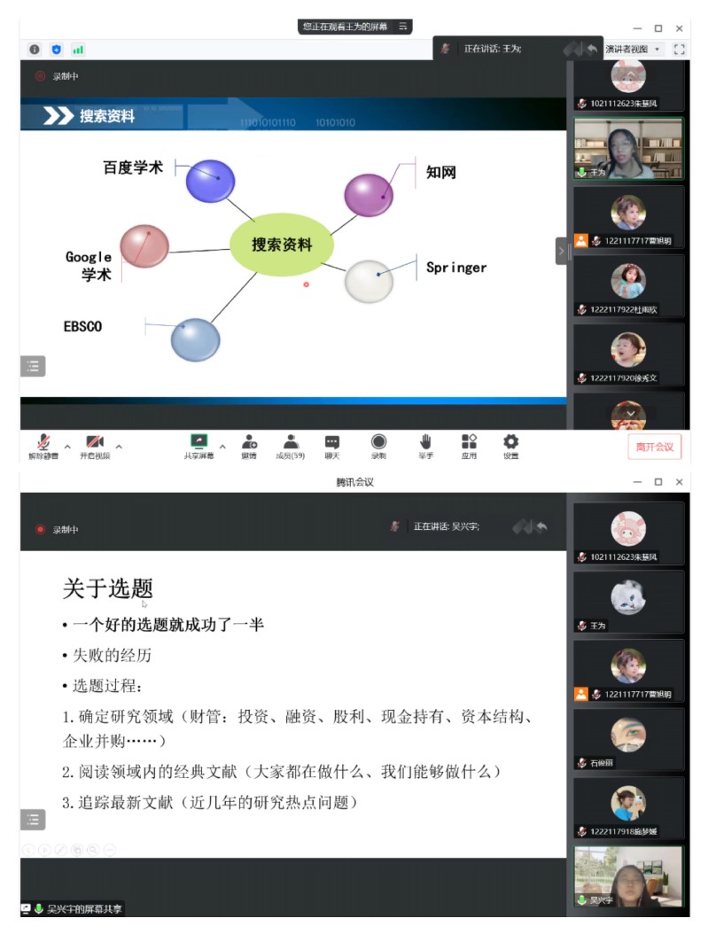 为进一步提升37000vip威尼斯会计专业研究生论文写作能力,营造浓厚的学术氛围,让研究生了解论文写作的规范性,拓宽学术研究思路,12月9日晚,威尼斯官网邀请王为老师和吴兴宇老师为会计专业研究生带来论文指导专题讲座,本次讲座通过腾讯会议以线上交流方式举行,威尼斯官网会计专业全体研究生参加。