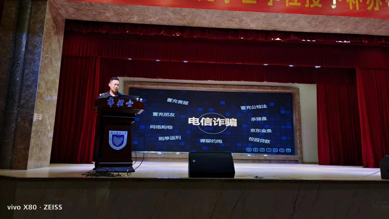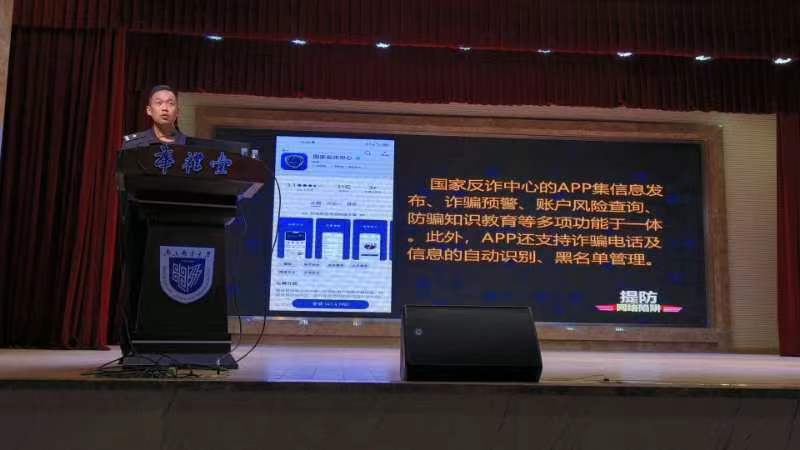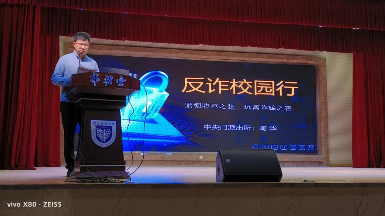 为进一步增强大学生防骗意识,提高反诈能力,普及法律知识,有效预防新型电信、网络诈骗,全面掀起“全民反诈”热潮,5月10日下午,威尼斯官网在华礼堂举行了防诈反诈专题讲座,邀请南京市鼓楼区中央门派出所陶华警官普及防骗反常识。37000vip威尼斯保卫处刘庆霄老师主持。37000vip威尼斯党委副书记、副院长郭强,分团委书记鲍捷,研究生辅导员华奕曦参会。37000vip威尼斯全体2022级本科生和研究生到会聆听。