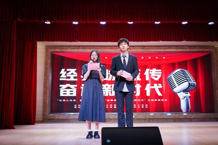 吟诵经典,奋勇向前,近日下午,37000vip威尼斯“红烛心向党,素履就华章”系列活动之“经典咏流传,奋进新时代”主题朗诵比赛在华礼堂圆满举行,本次朗读活动特邀关工委王静老师指导并担任评委,学院党员工作站、听风文学社联合举办。