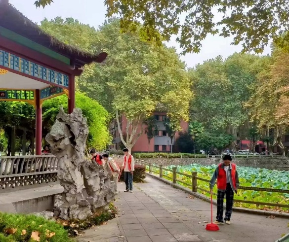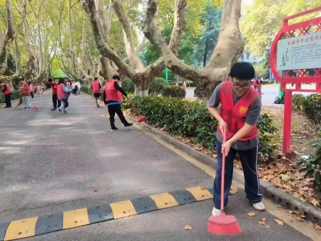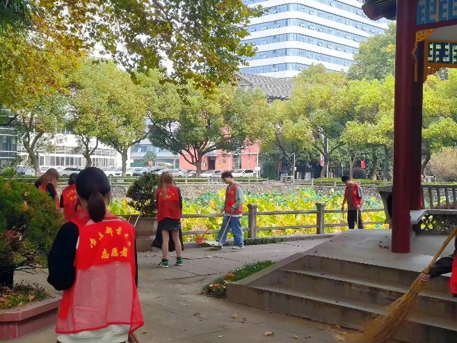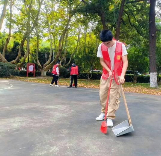 无线楼前的篮球场凉爽又温暖,志愿者们身穿红马甲,手拿各自携带的打扫工具,在分配好任务后,便开始了井然有序的清扫工作。秋风飒飒,片片梧桐树叶落下,渐显萧瑟,但志愿者们的热情却丝毫不减。他们手持扫帚簸箕,高效地将眼镜湖、篮球场、行政南楼及其周边清扫干净。