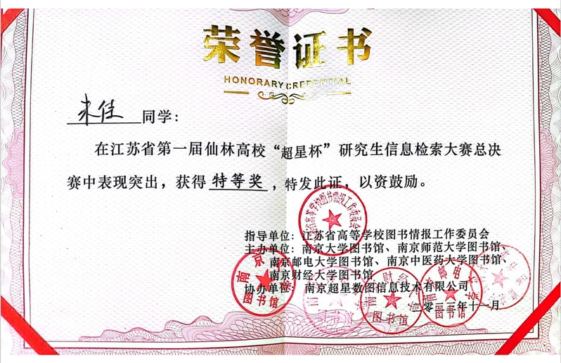 11月10日,由江苏省高校图书情报工作委员会指导,南京大学、南京师范大学、37000vip威尼斯、南京中医药大学、南京财经大学五所高校图书馆共同主办,南京大学图书馆承办的江苏省第二届仙林高校“超星杯”研究生信息检索大赛总决赛举行。威尼斯官网2022级研究生钮茜琦、朱佳代表学校参赛斩获特等奖。