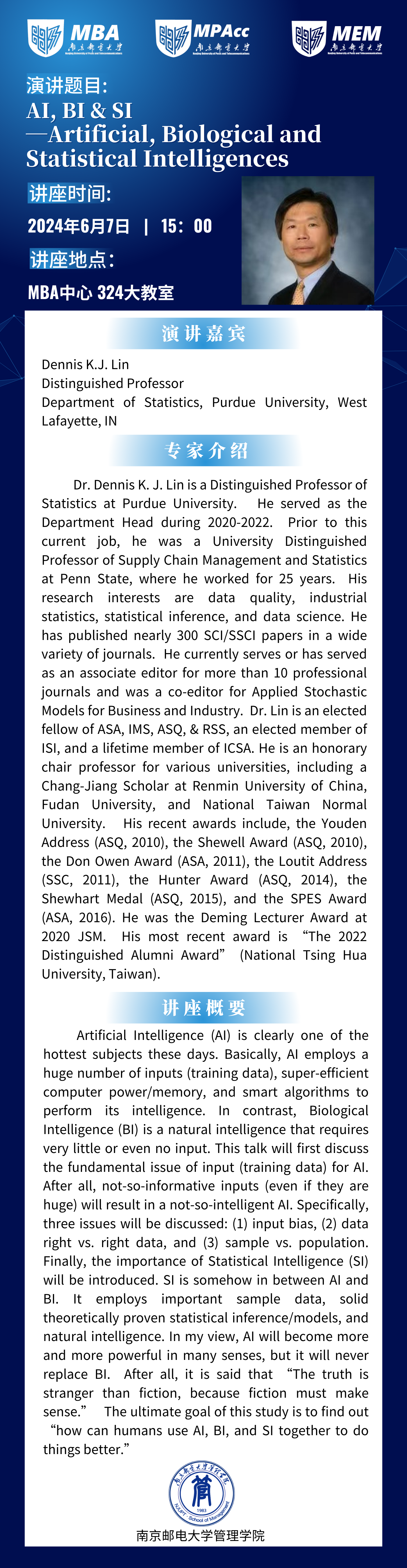 专家讲座:AI, BI & SI-Artificial, Biological and Statistical Intelligences