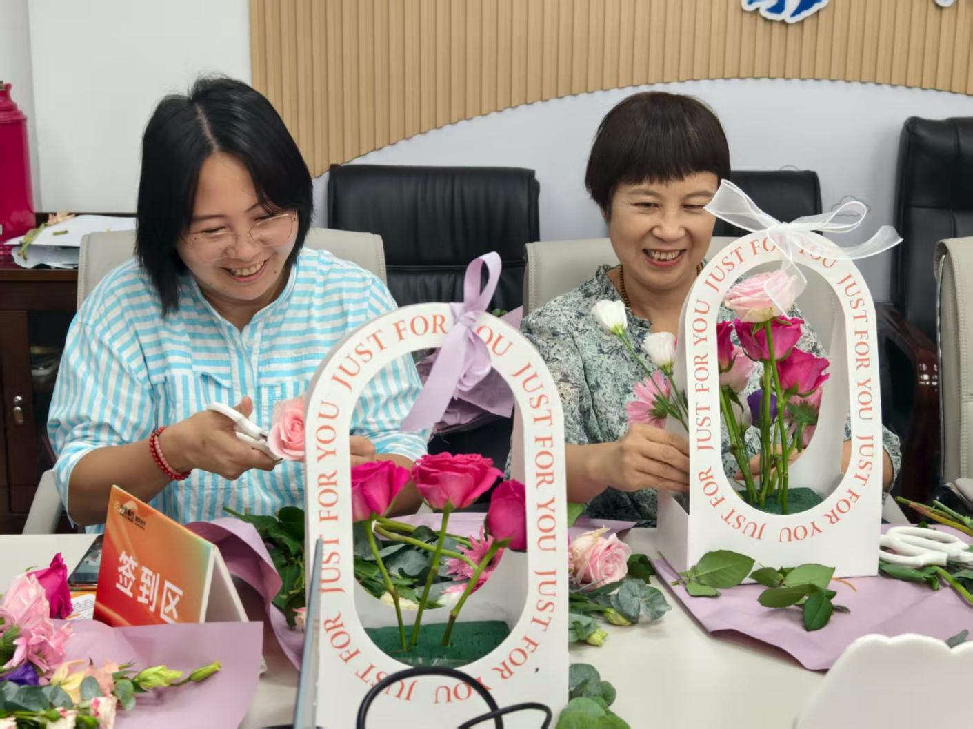 老师们兴致盎然,充分发挥想象力与创造力,将各种玫瑰、康乃馨等花卉巧妙搭配,精心制作成一个个独具匠心的花篮。现场欢声笑语不断,老师们在轻松愉悦的氛围中感受着艺术与自然之美。活动现场花香四溢,气氛温馨而热烈。工会特邀花艺师现场指导老师们进行插花创作。