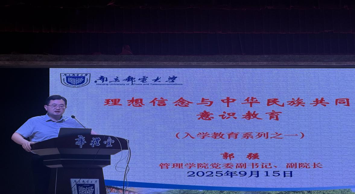 随后,学院党委副书记、副院长郭强教授开展新生理想信念与民族共同体意识教育。他将大学生涯形象概括为“青春大一”“阳光大二 ”“宁静大三”“沉淀大四”四个阶段,并鼓励新生尽快适应角色转变,找准个人定位,在集体中成长,引导新生在大学期间实现“增长知识、提升技能、启迪心智、练达人生”。此外,郭强副书记以党史为脉络,通过感人故事激发学生爱国情怀与使命担当,并详细讲解入党流程,为有志青年指明方向。